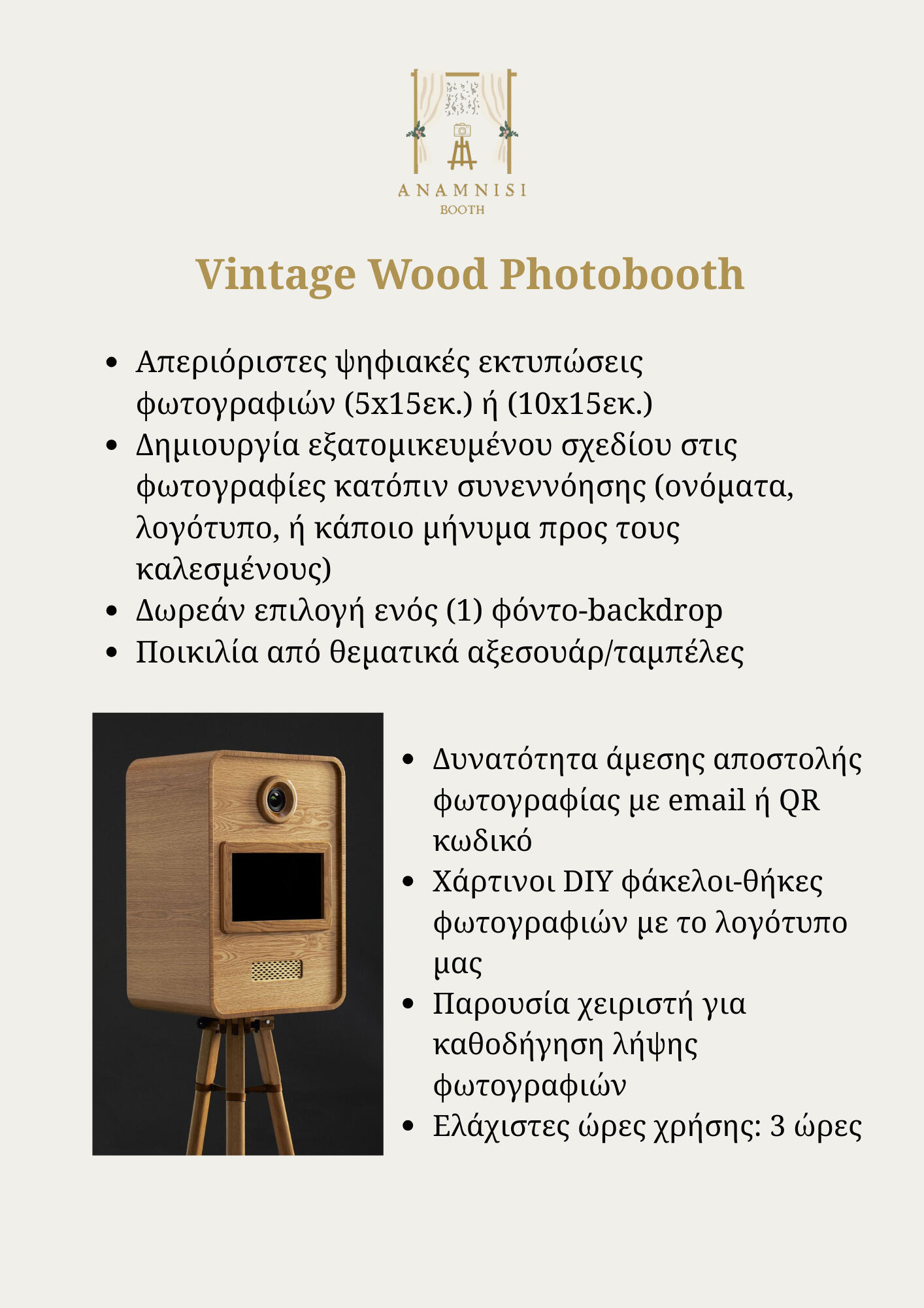 Τhat is exactly what we offer: a way to immortalize your guests' spontaneous and beautiful memories. Combining timeless charm and modern technology, Anamnisi Booth travels all over Greece and is perfect for all types of events!Ready to create memories?