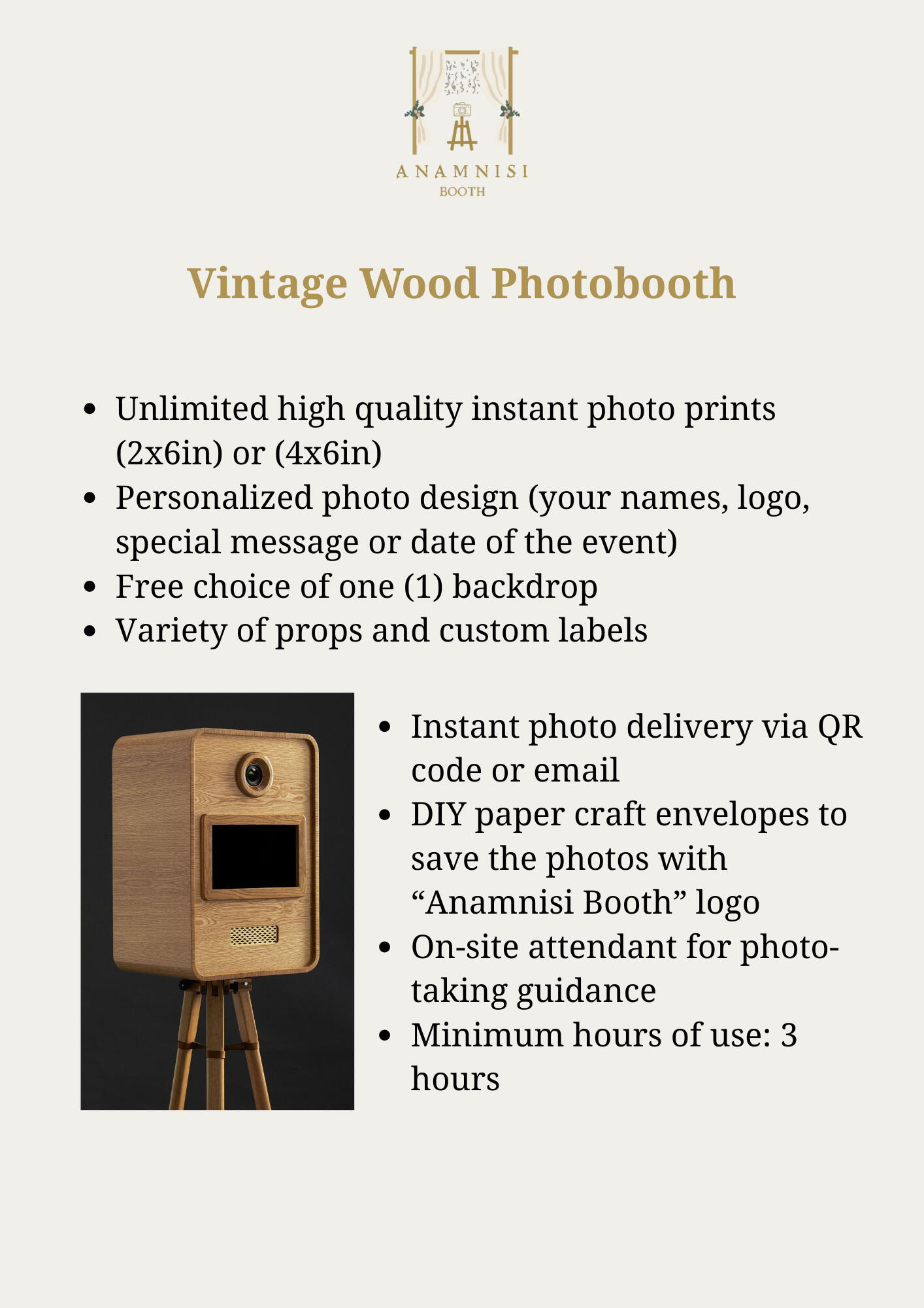 Την ονομάσαμε «Ανάμνηση» καθώς η λέξη αυτή σημαίνει μνήμη, ανάκληση, ενθύμηση. Και αυτό ακριβώς προσφέρουμε: έναν τρόπο να απαθανατίσουμε τις αυθόρμητες και όμορφες αναμνήσεις των καλεσμένων σας. Συνδυάζοντας διαχρονική γοητεία και μοντέρνα τεχνολογία, η Anamnisi Booth ταξιδεύει πανελλαδικά και είναι ιδανική για όλα τα είδη εκδηλώσεων!Έτοιμοι να δημιουργήσετε αναμνήσεις;