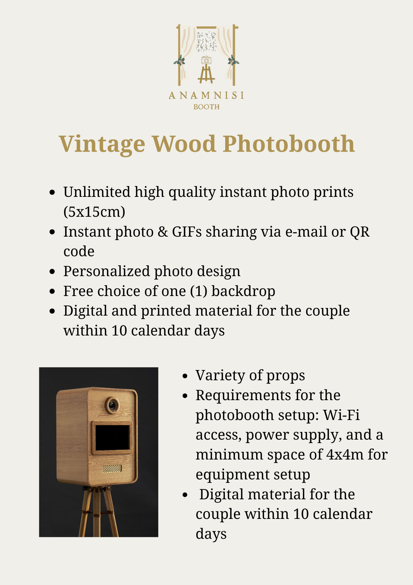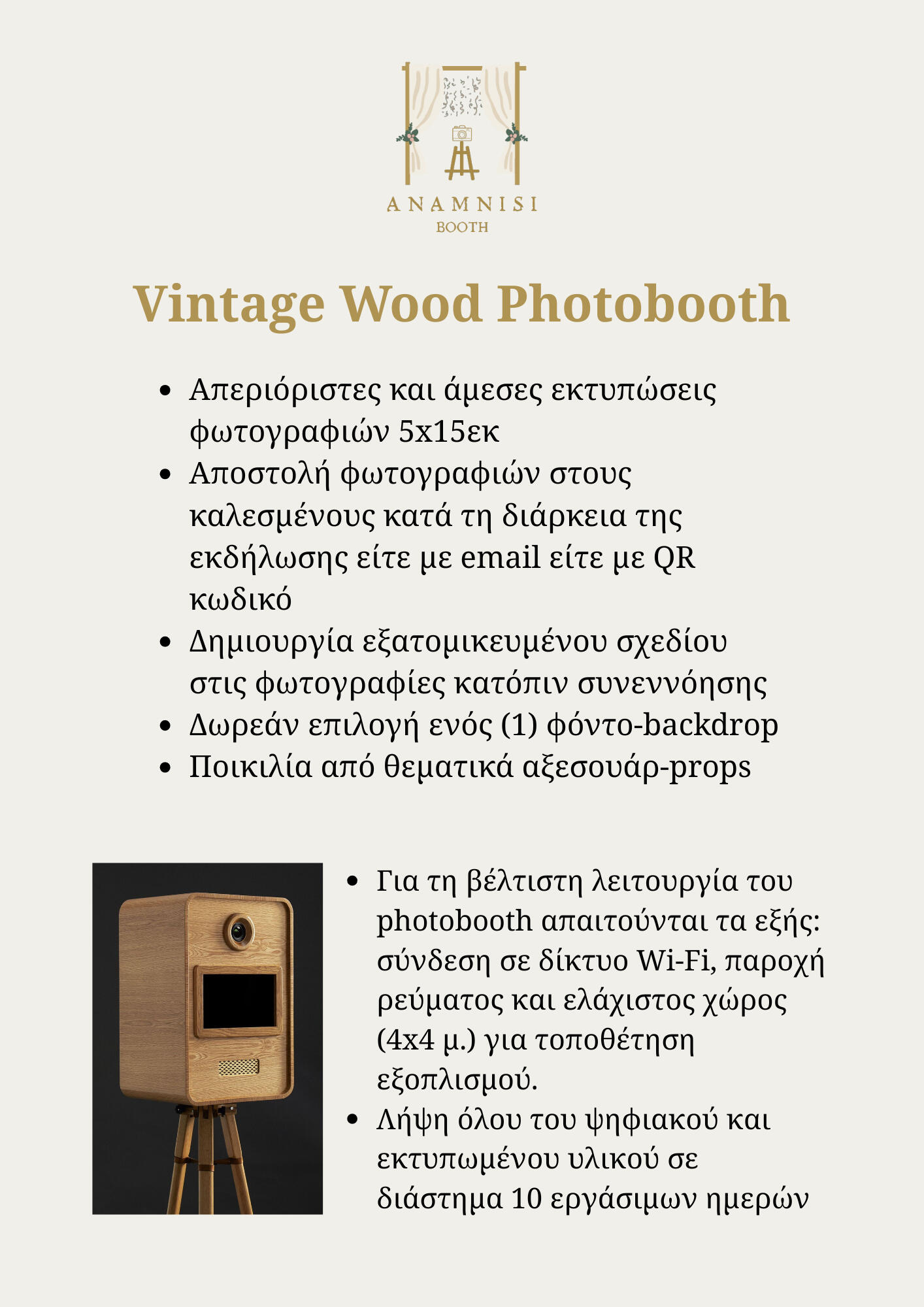 Την ονομάσαμε «Ανάμνηση» καθώς η λέξη αυτή σημαίνει μνήμη, ανάκληση, ενθύμηση. Και αυτό ακριβώς προσφέρουμε: έναν τρόπο να απαθανατίσουμε τις αυθόρμητες και όμορφες αναμνήσεις των καλεσμένων σας. Συνδυάζοντας διαχρονική γοητεία και μοντέρνα τεχνολογία, η Anamnisi Booth ταξιδεύει πανελλαδικά και είναι ιδανική για όλα τα είδη εκδηλώσεων!Έτοιμοι να δημιουργήσετε αναμνήσεις;